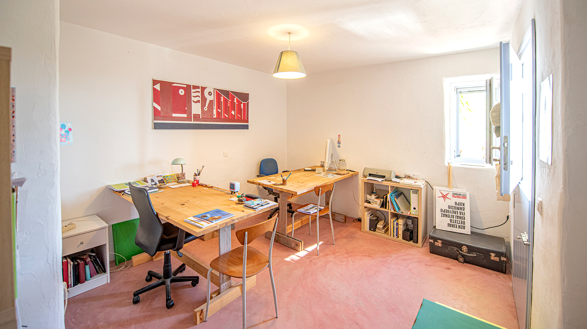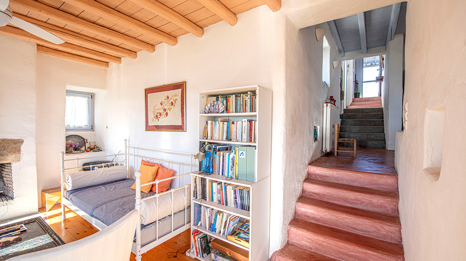 It is nicely set in the slope of the hill side, and features 3 bedrooms, 3 bathrooms, an office area, a kitchen-dining with traditional wood oven, a living room with fireplace, a warehouse for storage and the heating system installations.